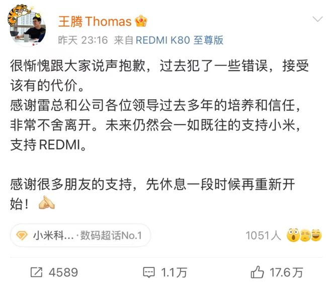 8日深夜,王腾在微博回应称:很惭愧跟大家说声抱歉,过去犯了一些错误,接受该有的代价。感谢雷总和公司各位领导过去多年的培养和信任,非常不舍离开。未来仍然会一如既往的支持小米,支持REDMI。感谢很多朋友的支持,先休息一段时候再重新开始!