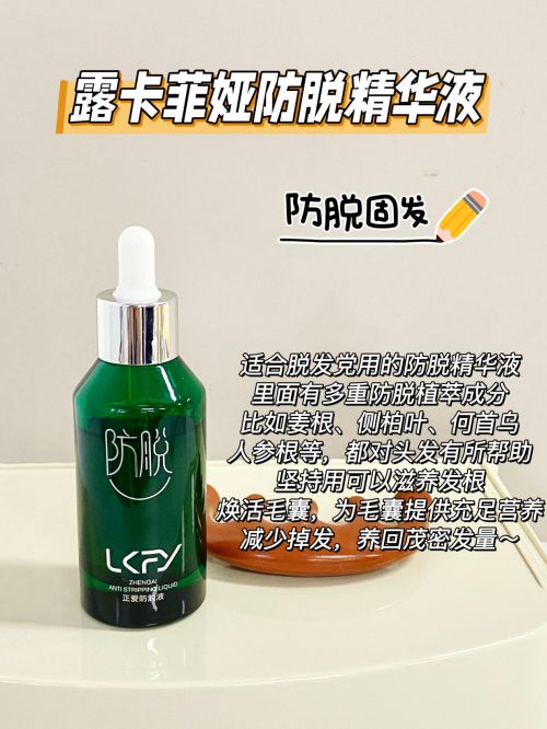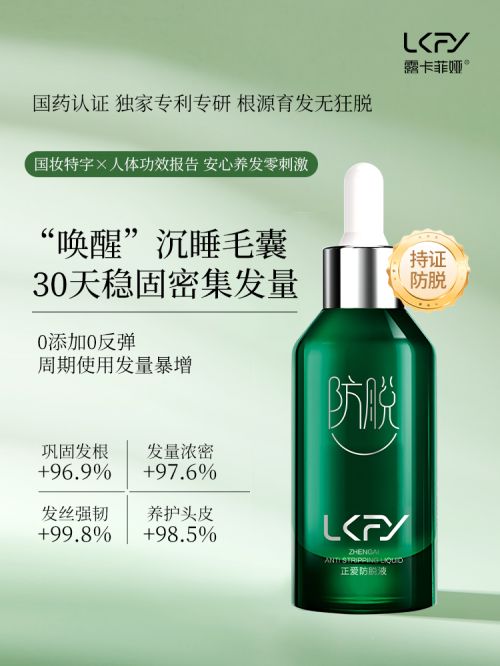 露卡菲亚防脱精华液凭借国家认证防脱特证+人体功效测试检测报告双重背书双重加持,为其安全性与可靠性提供了坚实保障。该精华液聚焦于“防脱”功效,有助于使头发恢复至茂密状态。