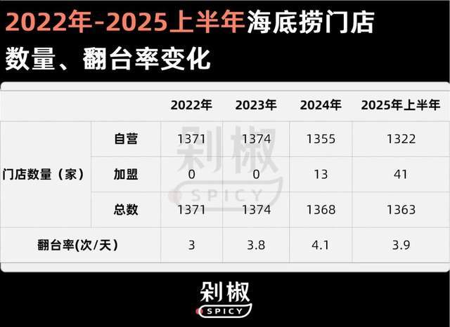 刚刚过去的半年里,海底捞一边关店“止亏”,一边扩张,门店净减少5家。截至2025年6月30日,海底捞品牌共经营1363家餐厅,其中自营餐厅中国大陆地区1299家,港澳台地区23家,另有加盟餐厅共41家。