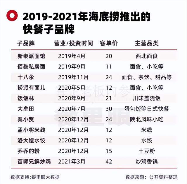 早在2019年开始,海底捞就通过“广撒网、快速试错”的策略快速孵化了一批子品牌。据餐企老板内参统计,2019-2021年,海底捞瞄准炒鸡、面食、小吃等快餐品类,推出了11个子品牌。