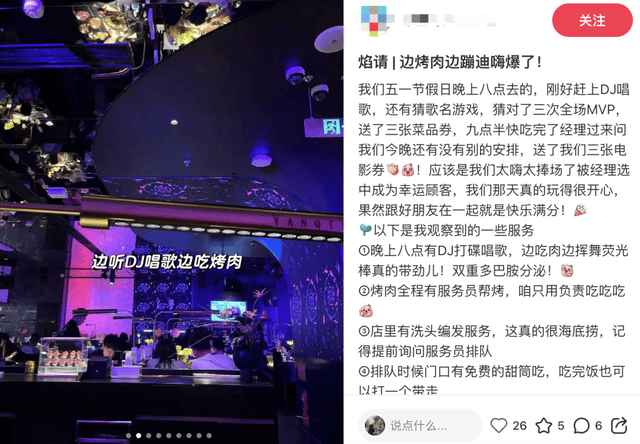 让“焰请烤肉铺子”出圈的场景便是其将晚上十点后的门店爆改成潮流夜店,黑色主调搭配暖光的轻奢风质感设计吸引众多年轻人前往打卡。此外,店内还免费提供洗头、编小辫等海底捞式特色服务。