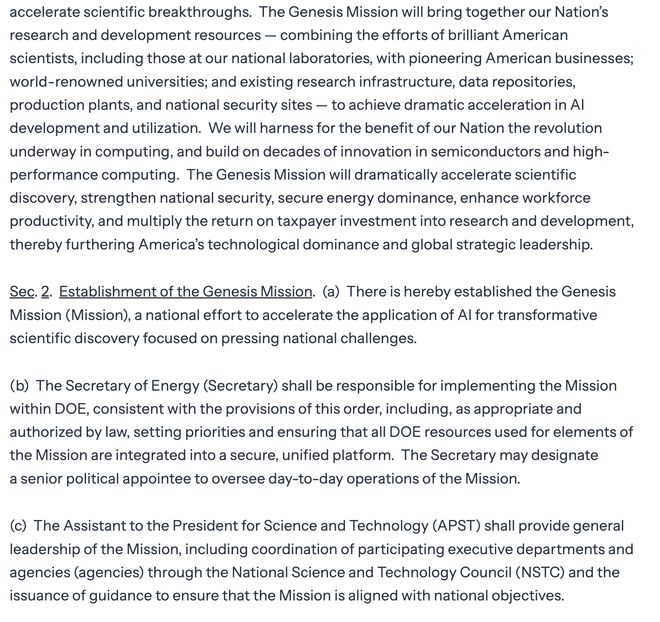 这是一个全国性的努力,旨在加速AI在变革性科学发现中的应用。该行政命令指示总统科技助理牵头协调主要联邦机构,包括美国国家科学基金会NSF、美国国家标准与技术研究院NIST、美国国立卫生研究院NIH等,借助AI技术从能源、医疗、制造业等跨领域数据集中挖掘科学发现。